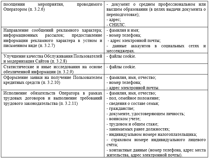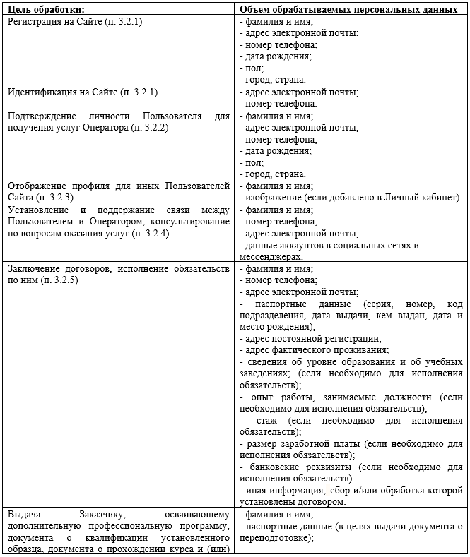 4.1 Объем обрабатываемых Оператором персональных данных зависит от цели обработки персональных данных, обработка персональных данных осуществляется Оператором согласно таблице, приведенной ниже: